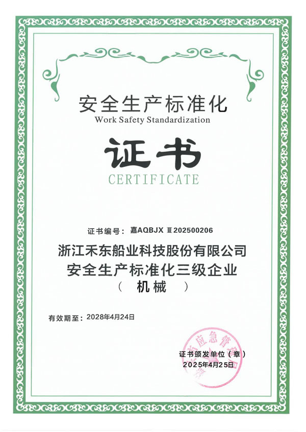 公司具備鋼質(zhì)船舶制造企業(yè)二級(jí)∥類、鋁質(zhì)船舶制造企業(yè)三級(jí)和纖維增強(qiáng)塑料船舶制造企業(yè)二級(jí)類資質(zhì),擁有中國(guó)船級(jí)社認(rèn)證公司認(rèn)證的IS09001質(zhì)量管理體系、ISO14001 環(huán)境管理體系認(rèn)證證書和OHSAS18001職業(yè)健康安全管理體系和按照國(guó)家相關(guān)標(biāo)準(zhǔn)建立的安全生產(chǎn)標(biāo)準(zhǔn)化三級(jí)體系。